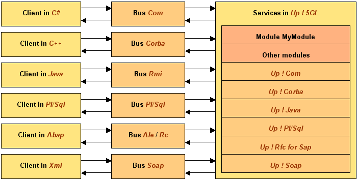 The mecanisme to call services from Up ! Virtual Machine is set up by Up ! Object Request Broker. It is very easy to set up because you only have to use the remote access operator: